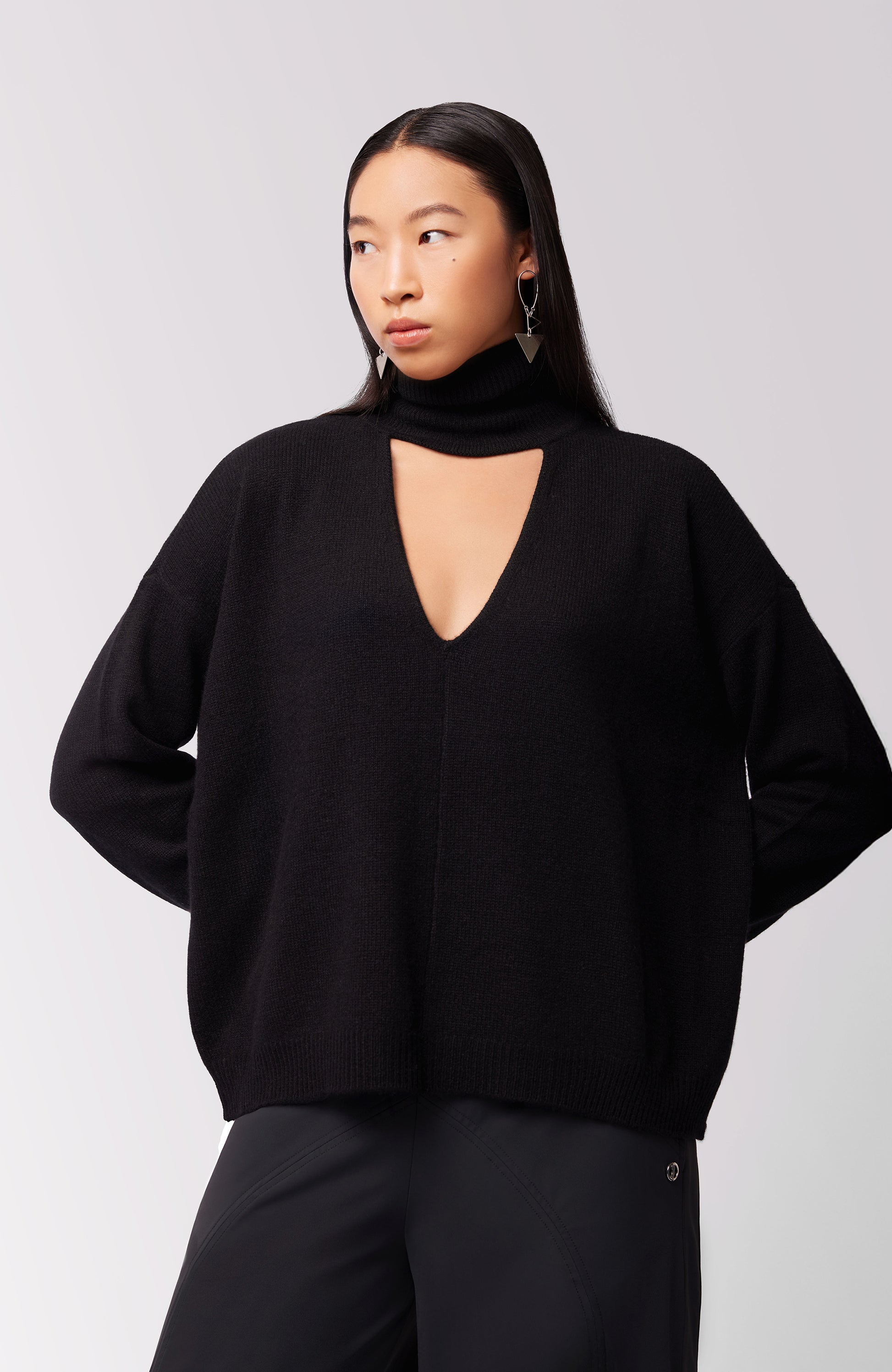• Features: Cutout neckline with attached ribbed turtleneck, deep V-front cutout, relaxed fit, ribbed cuffs and hem