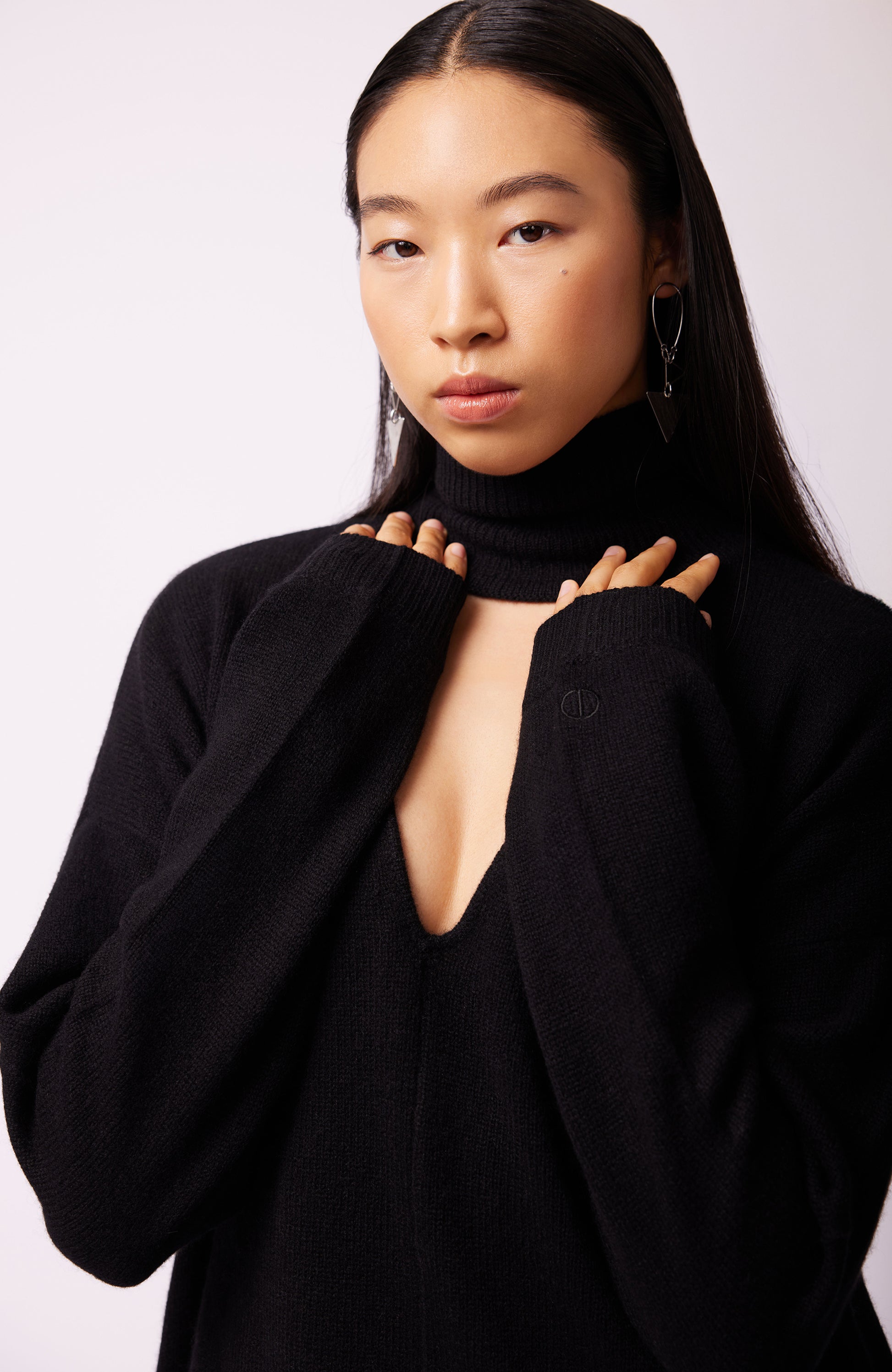 Crafted from 100% washable cashmere, the Chloe Cashmere Turtleneck features a cutout neckline with an attached ribbed turtleneck collar, offering a striking contrast between structure and fluidity. The deep V-front cutout adds an element of modern sophistication, while the relaxed fit ensures effortless drape and comfort.